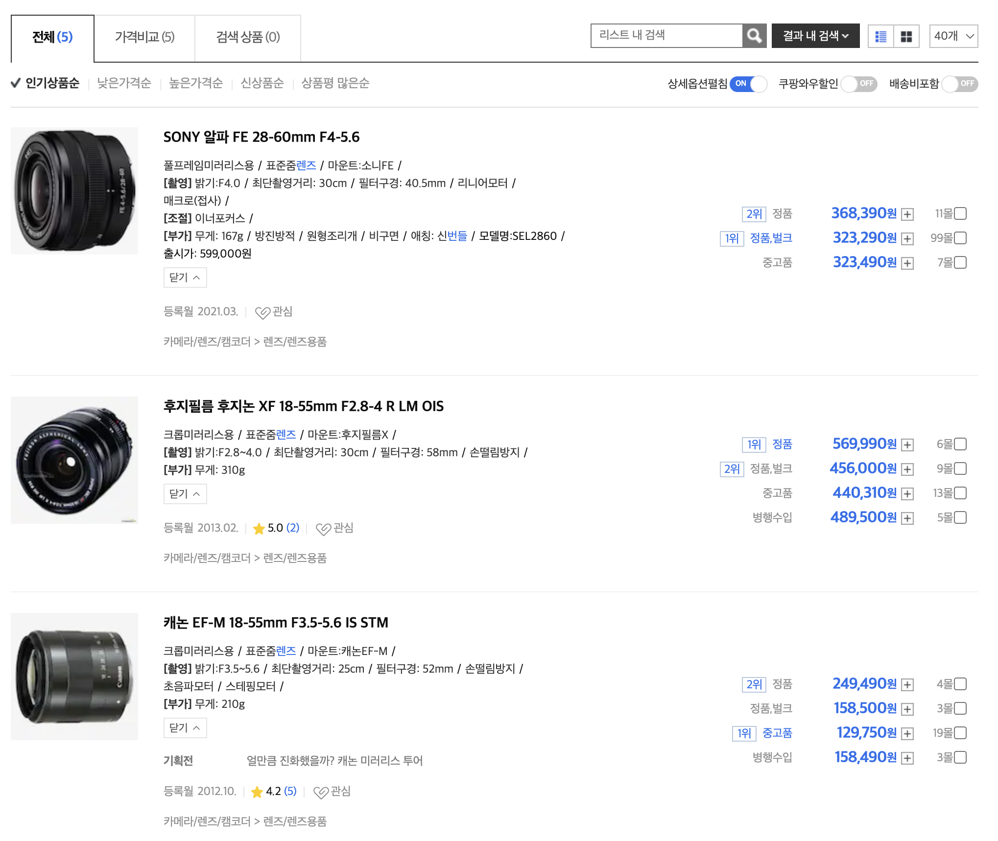 - 새제품과 중고 렌즈 가격 차이 알아보기 (얼마 차이 안난다면 새상품도 고려)
