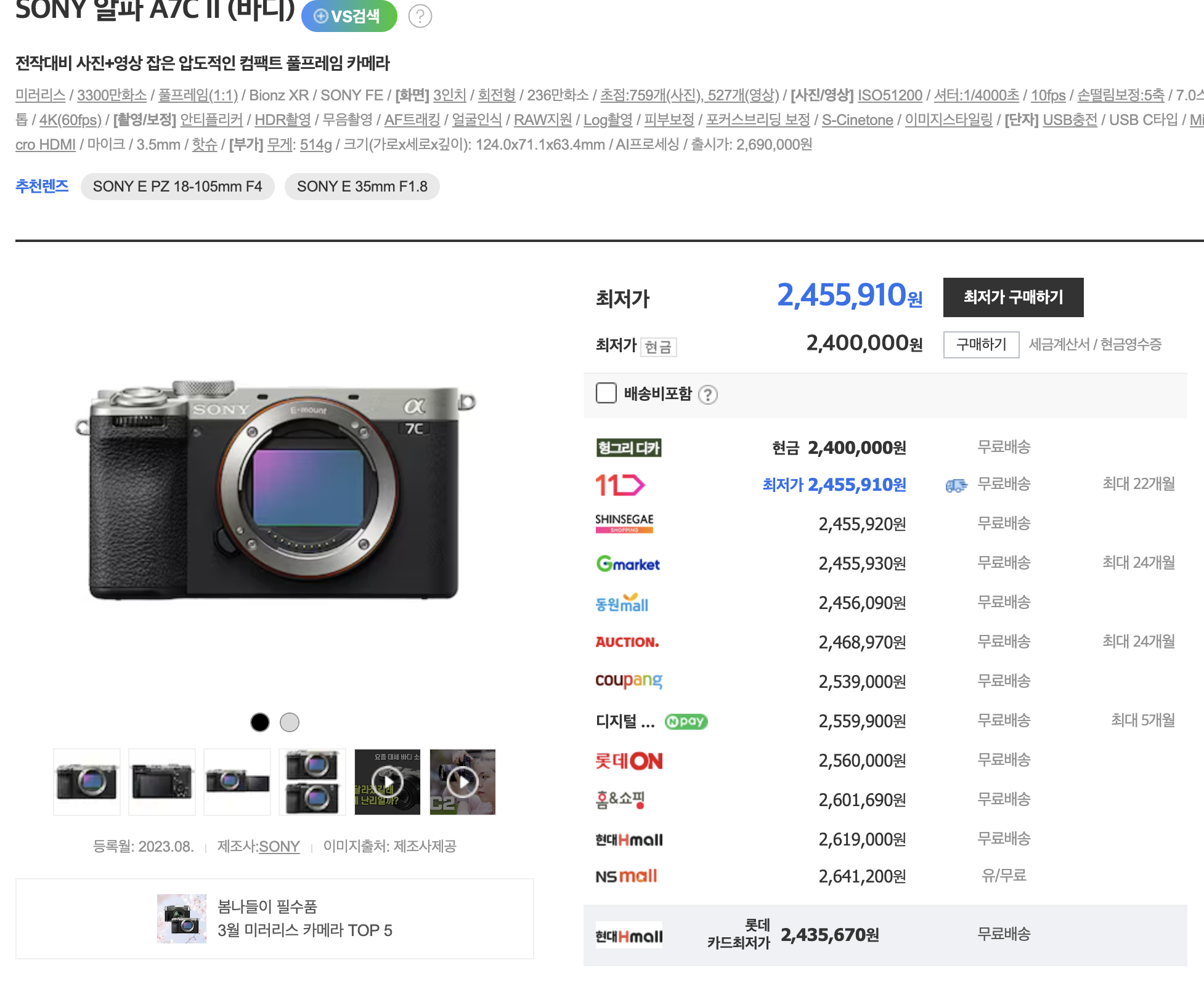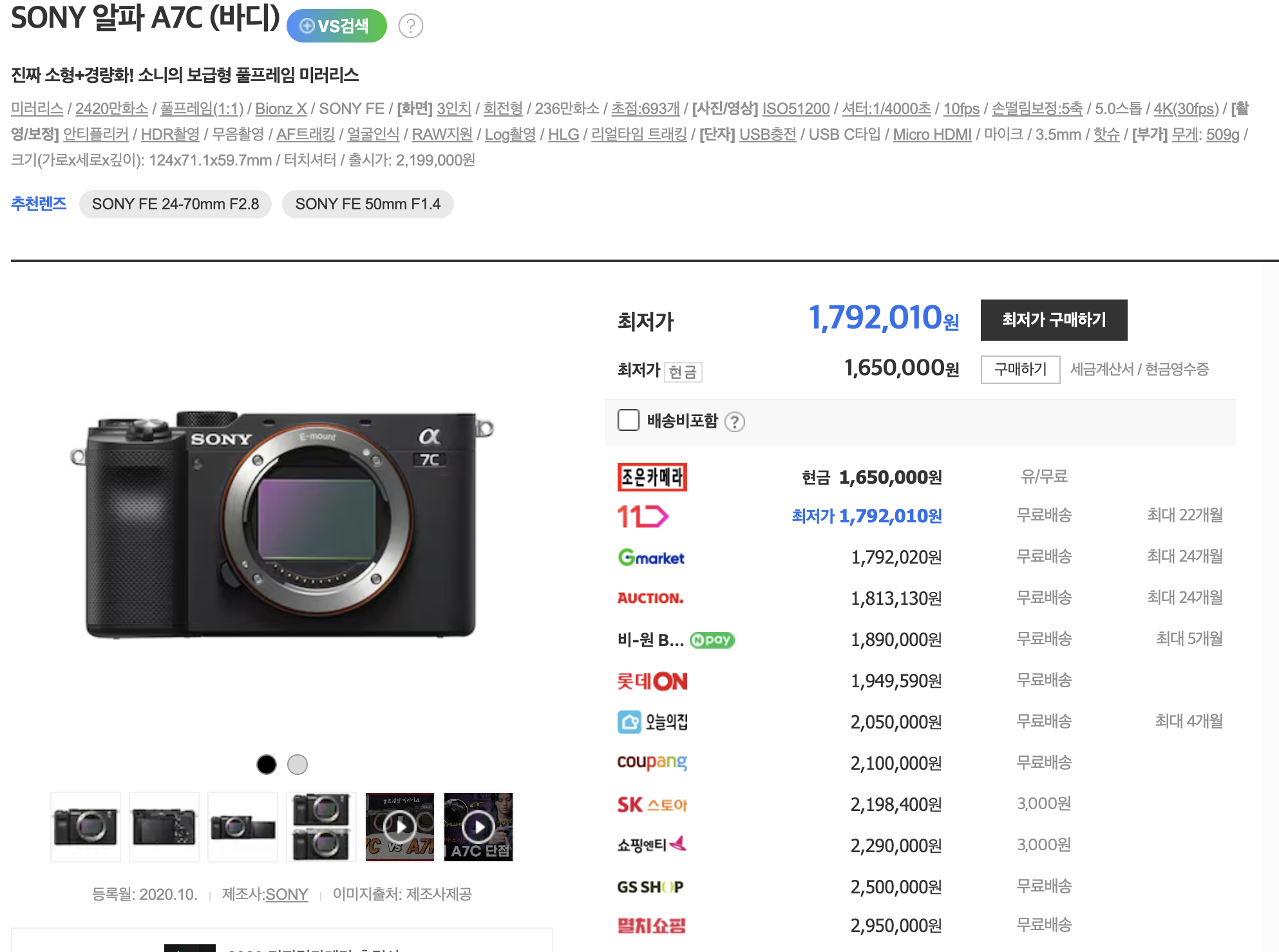 그런데 A7C 카메라를 보면 2020년도 10월에 구매 비교 사이트에 등록된 걸 볼 수 있는데 2024년도 기준으로 약 4년된 카메라인 것입니다. 출시가에 비하면 180만 원 정도로 많이 가격이 떨어진 상황이고 당시로서는 A7C 시리즈의 초기 1세대 모델로 볼 수 있습니다. 그런데 최근에 후속 모델이 출시되었지요.