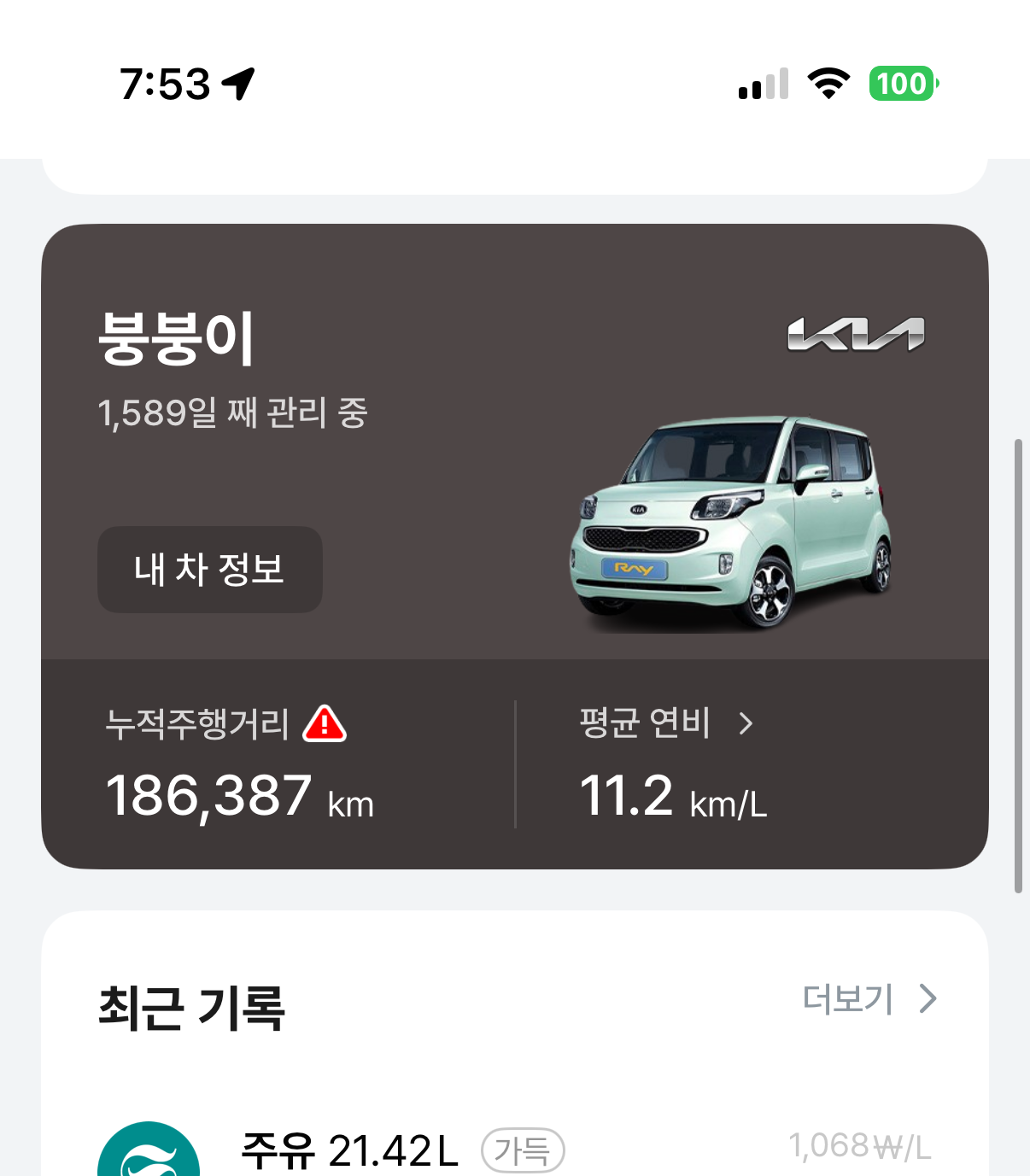 먼저 가장 중요한 경제성 이야기부터 해보겠습니다. 제가 4년간 타면서 기록한 실제 연비는 평균 11km/L입니다. LPG로 이 정도 연비가 나오는 건 놀라운 수치인데, 실제로 동일한 LPG 중형차 (쏘나타)만 하더라도 7~9km/L 실연비이기 때문이죠. 출퇴근 용도로 사용하는데도 동일한 LPG 연료를 사용하는 중형차 대비 30~40% 이상 연료비 절약 체감을 할 수 있었습니다. 여기에 경차 유류세 환급 카드를 적용받으면 LPG여도 주유할 때마다 할인(환급)을 받을 수 있죠! 실제 다른 오너분들도 "자유로 위주로 타니 연비평균 11.3정도 나옵니다. 대강 만원에 100km간다고 보심 됩니다"라고 후기를 남길 정도로 비슷한 수치가 나옵니다.