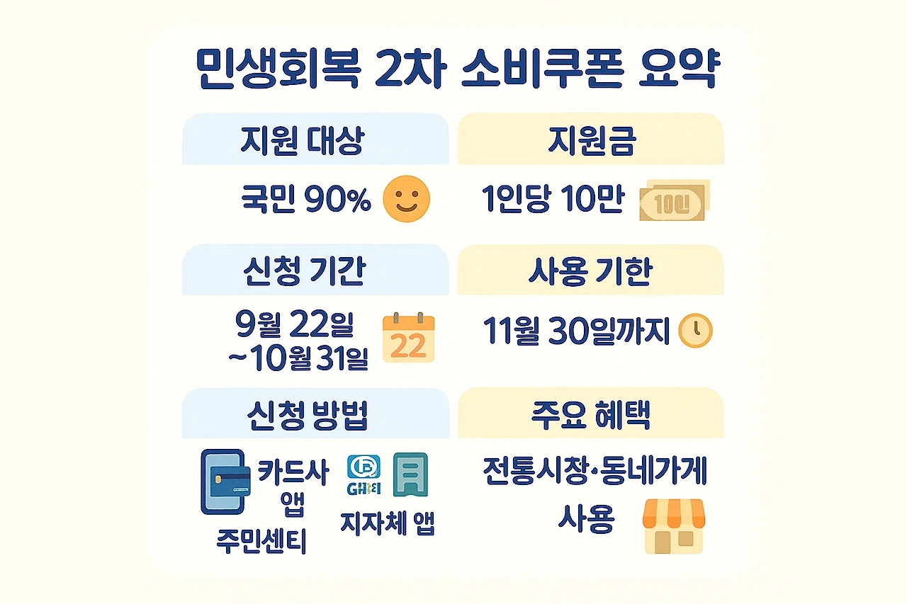 장보기 값이 확 올라서 지갑이 가벼워졌다는 말, 다들 공감하시죠? 정부가 2025년 9월 22일부터 ‘민생회복 소비쿠폰 2차 지급’을 시작합니다. 1인당 10만 원 지원금이 추가로 지급되고, 전통시장·동네가게 등에서 바로 체감할 수 있는 혜택이 이어집니다. 아래에서 신청 방법과 기간을 한 번에 정리해 드릴게요.