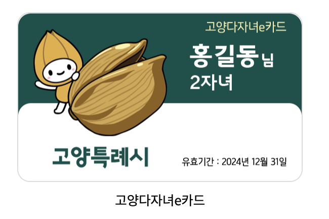 | 발급 방법 | '고양시 고양다자녀e카드' 앱 다운로드 후 본인인증 |