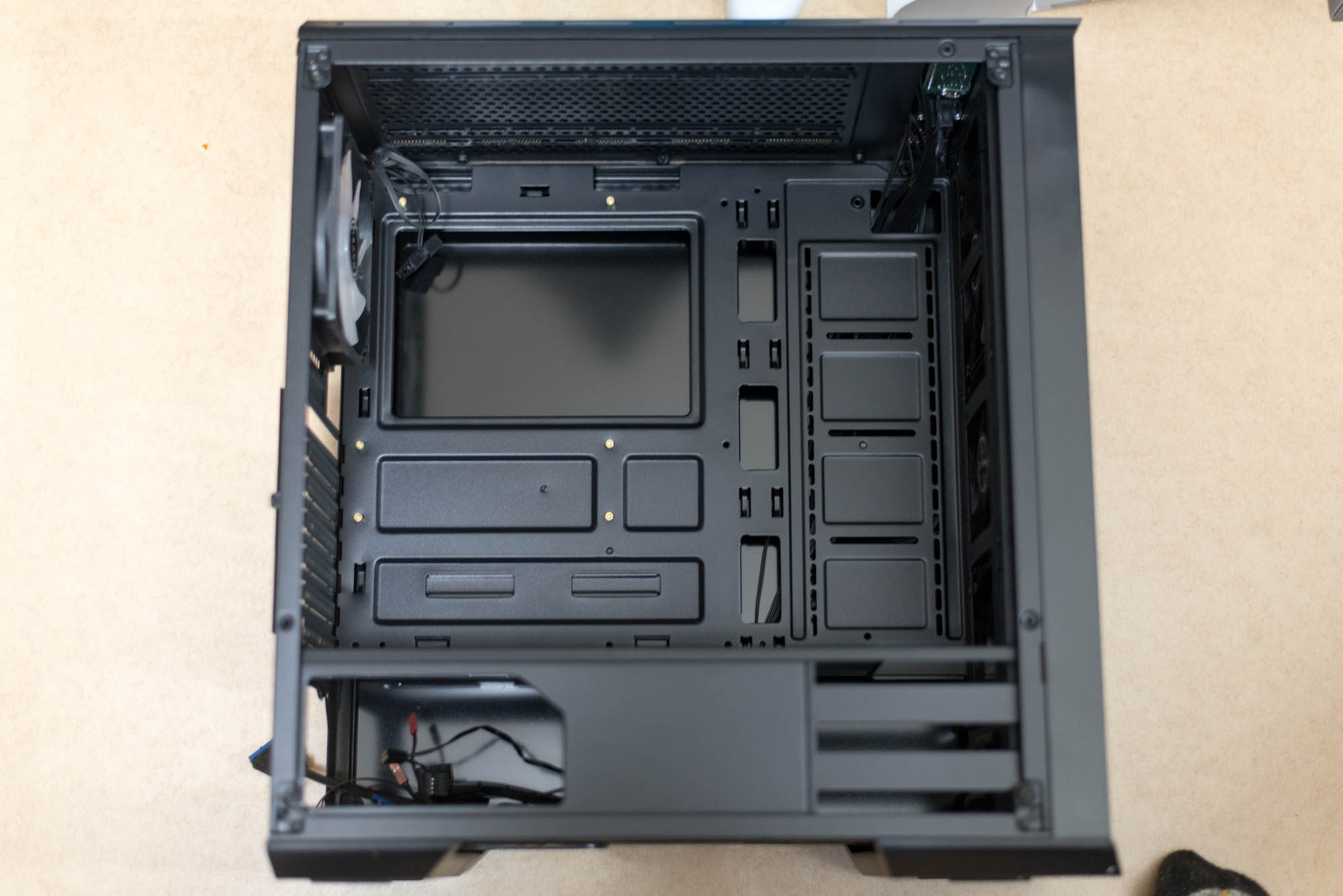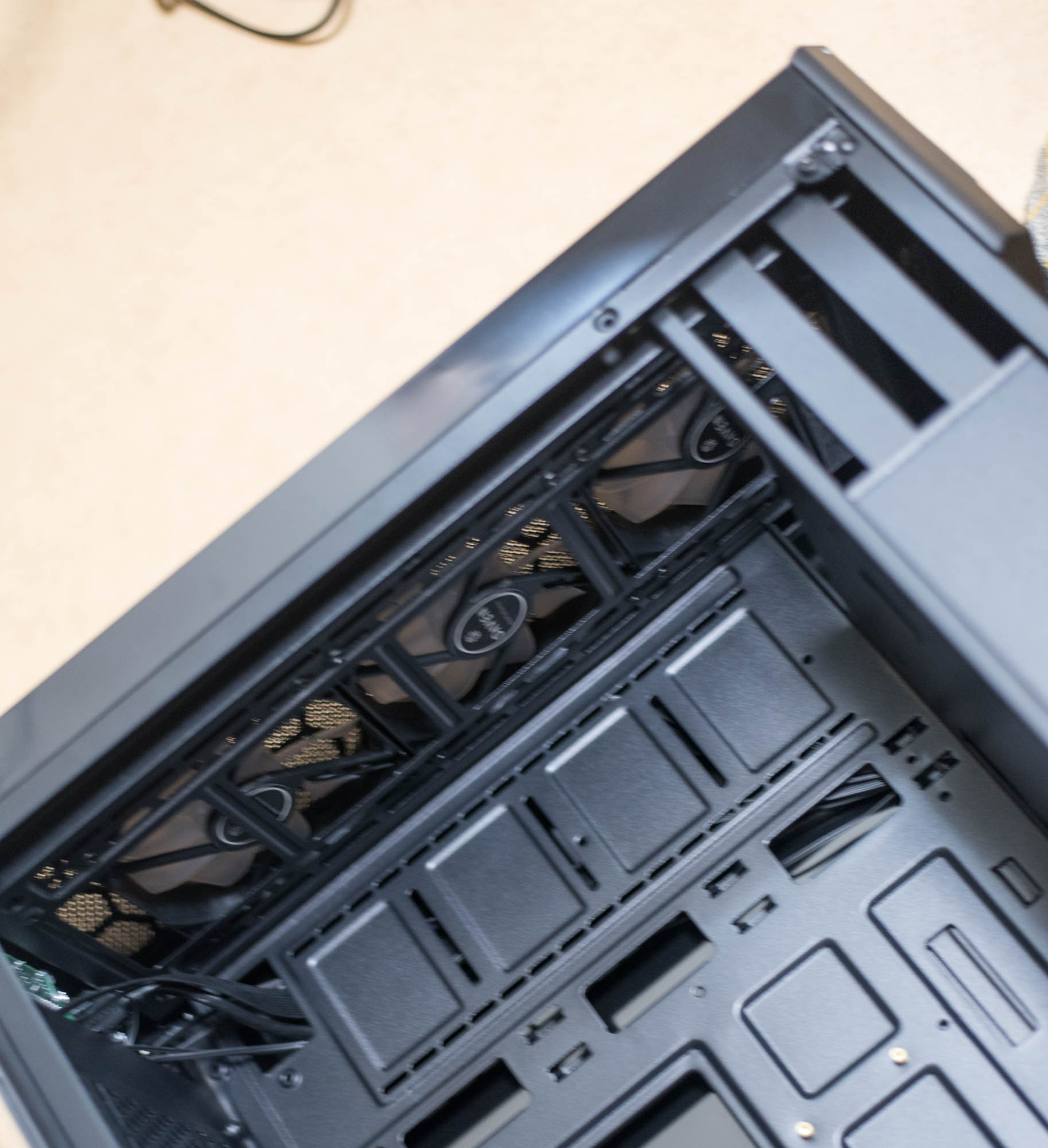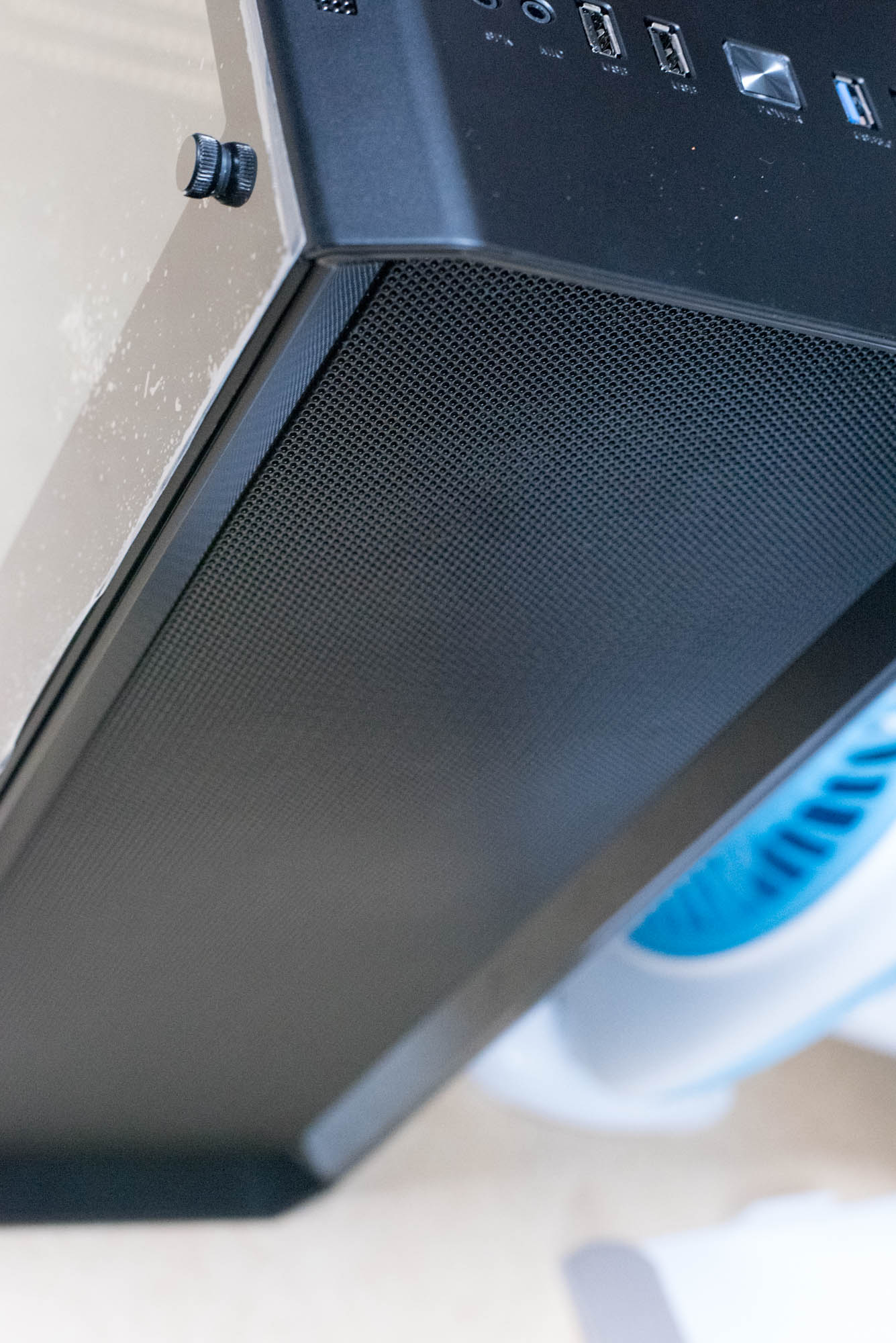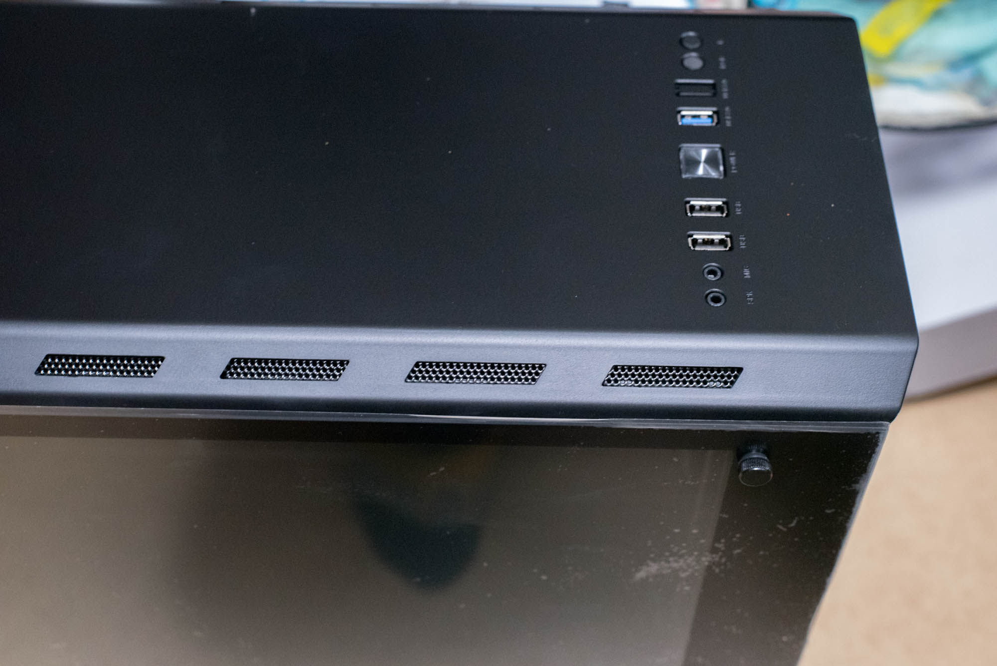 전면은 메쉬타입으로 되어 있고, 3개의 RGB 팬이 달려 있어 내부 공기 순환에 효과적으로 보이고, 후면에도 RGB 팬이 하나 달려있어서 총 RGB 팬 4개가 기본으로 달려있습니다. 상단부는 전원버튼을 포함해 USB 3.0과 USB 2.0 그리고 오디오 포트와 리셋 버튼이 자리하고 있습니다. 개인적으로 아쉬운 건 상단이 전면과 같이 메쉬 형태로 되어 있지 않고 막혀있어서 수냉 쿨러 같은 걸 달 수 없다는 게 아쉽긴 합니다. 물론 없는 건 아니지만 환기구 홀은 사진에 보이시다시피 상단 측면쪽으로 해서 나와 있습니다. 하지만, 가격대비, 가성비 케이스라고 볼 수 있는 케이스라 생각합니다.