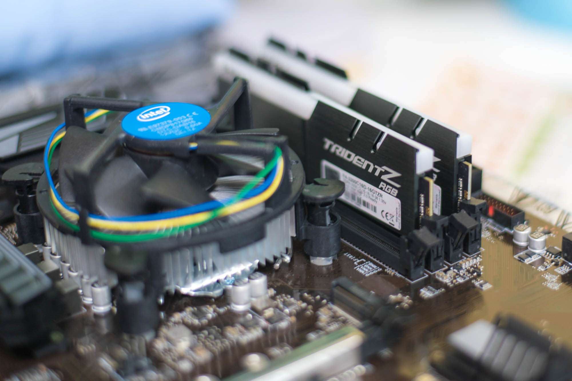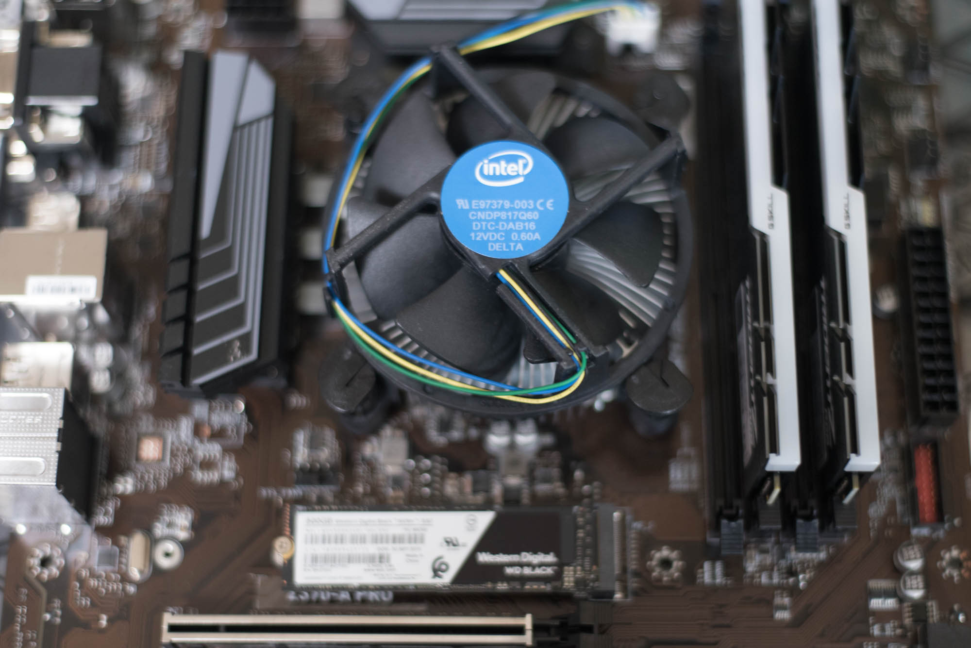 고정한 다음 CPU 쿨러를 장착합니다. (i5-8400 CPU의 TDP가 65W 정도이며 인텔 정품 쿨러 즉 초코파이 쿨러가 65W 까지 커버해준다고 하여 기본 쿨러를 장착하였습니다. 추후 온도가 많이 높으면 사제로 바꿀 예정입니다. 요즘 저렴하게 많이 나오는 사제 쿨러인 딥쿨이나 가성비 쿨러를 구입하시는 것도 추천드립니다.)
