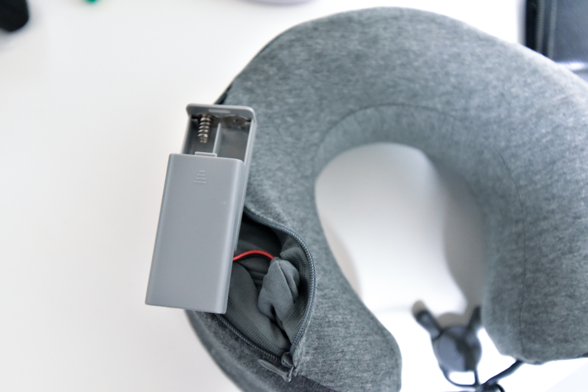목 베개 한쪽 부분을 보게 되면 지퍼가 하나 있는데, 열어 보면 건전지 홀더가 보입니다. 여기에 건전지를 넣고 홀더를 닫고 넣어주면, 전원버튼을 꾹 눌러 안마기능도 쓸 수 있습니다. 총 2가지 모드가 있는데 툭툭 치는 안마모드하고, 쓰다듬어주는 듯한 느낌의 수면모드 2가지가 있는 것으로 알고 있습니다. 안마기능.. 할 말이 좀 많이 있습니다.