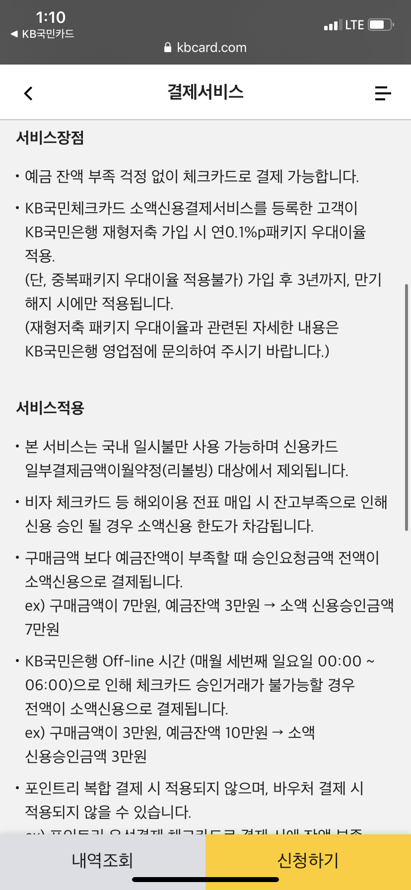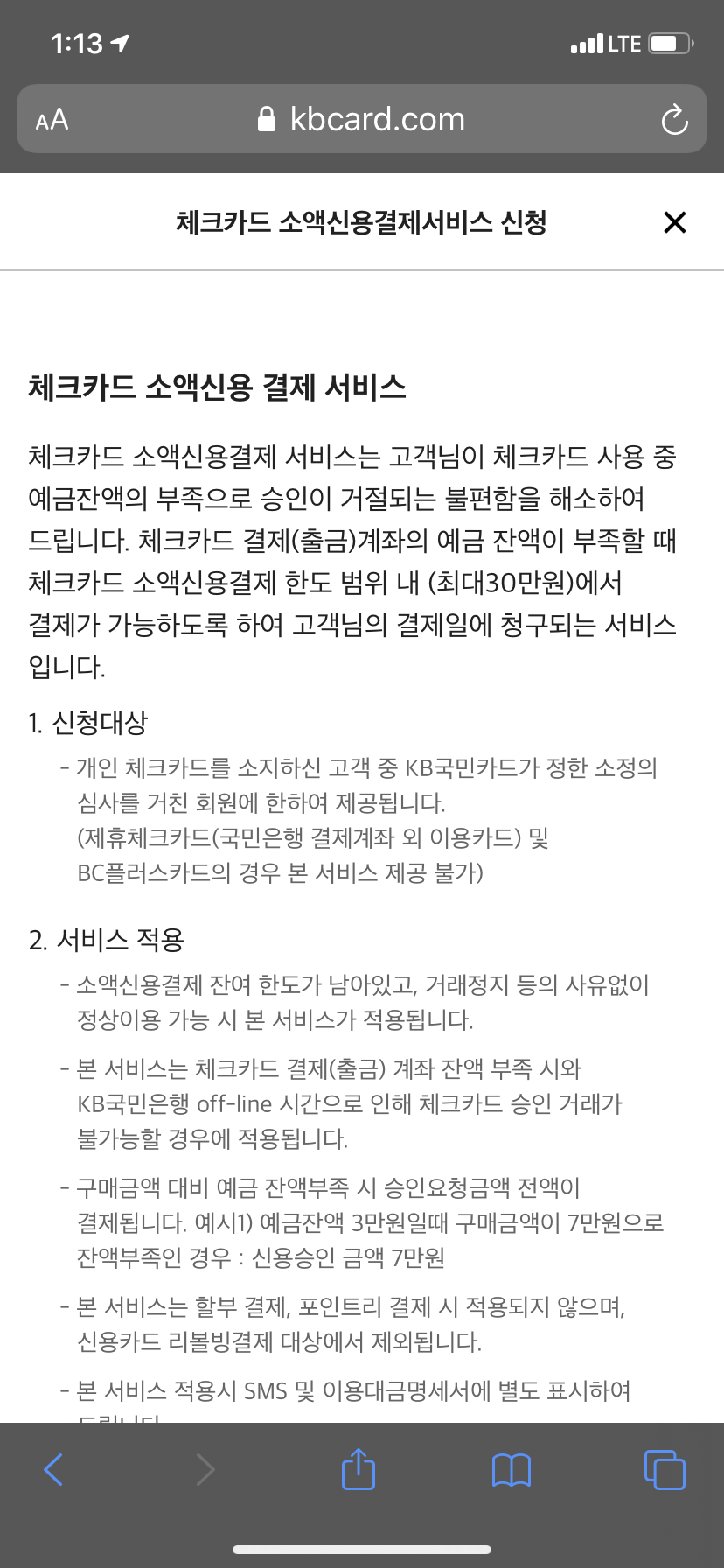 먼저, 이 체크카드 소액 신용 결제서비스라는 것은 현재 사용하고 있는 카드사 홈페이지와 카드사 앱에서 신청하거나 전화로 문의할 수 있습니다. 대부분 30만원 한도 내에서 체크카드를 신용으로 결제할 수 있는 서비스로 잔액이 부족할 때 결제할 금액이 신용으로 결제됩니다. <신청 시 대부분 30만원의 한도가 부여되는 것 같습니다. 사람마다 한도 폭은 다를 수 있으나 별다른 소득증빙이 없는 4등급 신용등급도 한도가 부여되었습니다.>