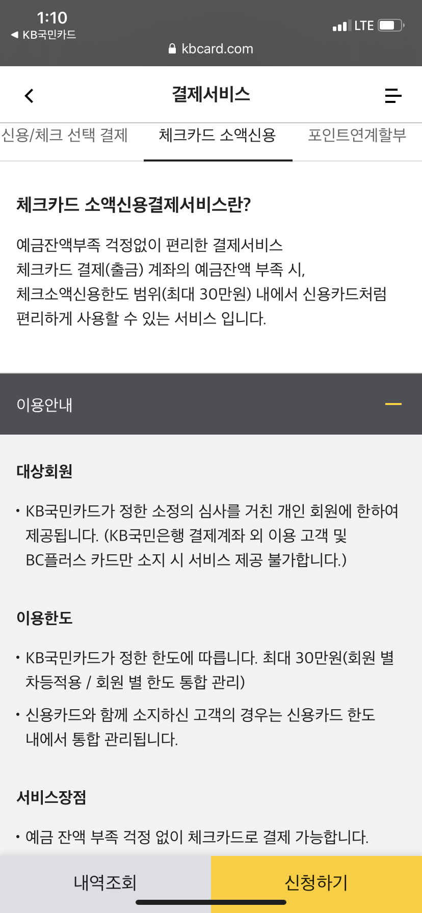 먼저, 이 체크카드 소액 신용 결제서비스라는 것은 현재 사용하고 있는 카드사 홈페이지와 카드사 앱에서 신청하거나 전화로 문의할 수 있습니다. 대부분 30만원 한도 내에서 체크카드를 신용으로 결제할 수 있는 서비스로 잔액이 부족할 때 결제할 금액이 신용으로 결제됩니다. <신청 시 대부분 30만원의 한도가 부여되는 것 같습니다. 사람마다 한도 폭은 다를 수 있으나 별다른 소득증빙이 없는 4등급 신용등급도 한도가 부여되었습니다.>