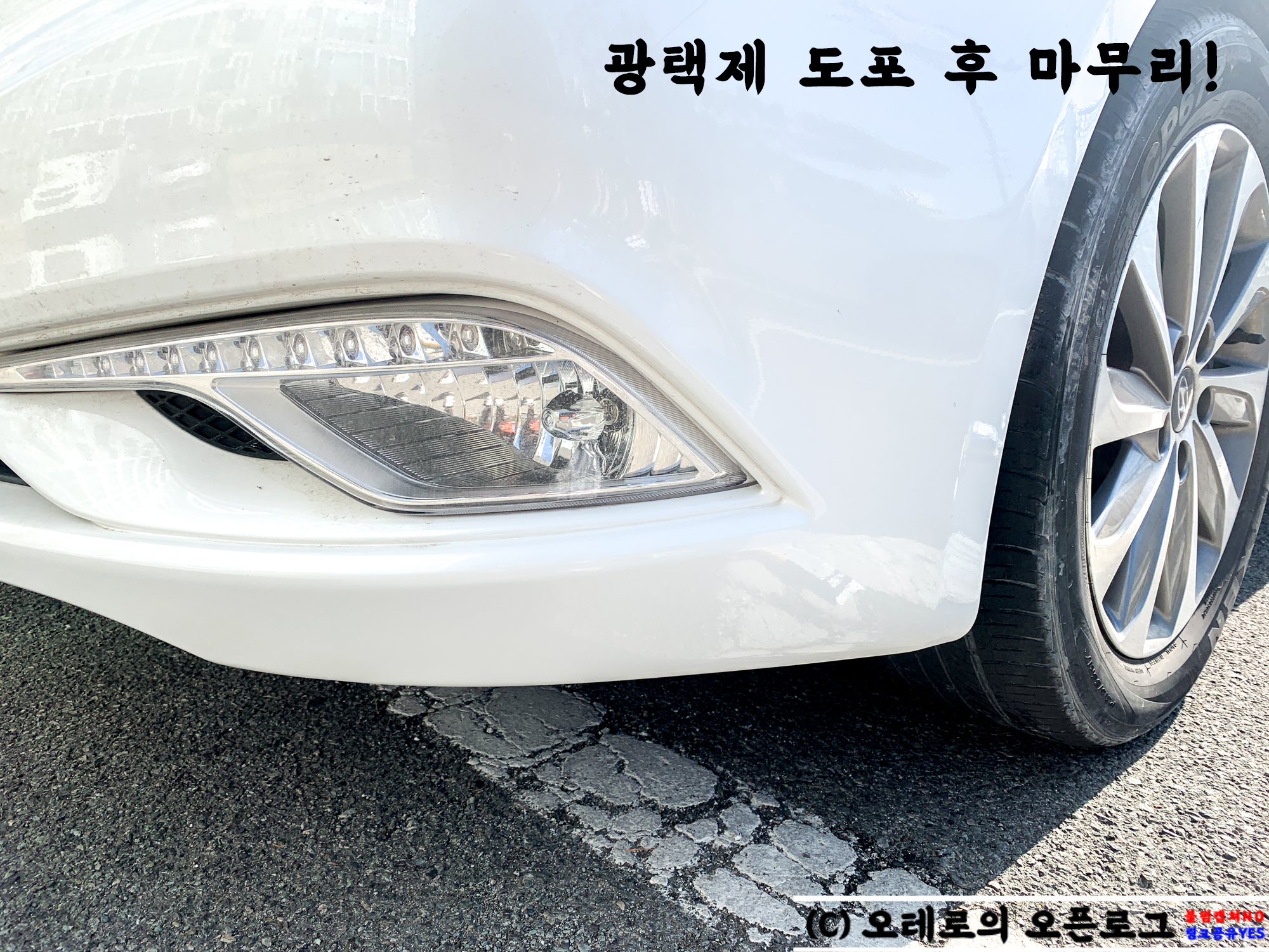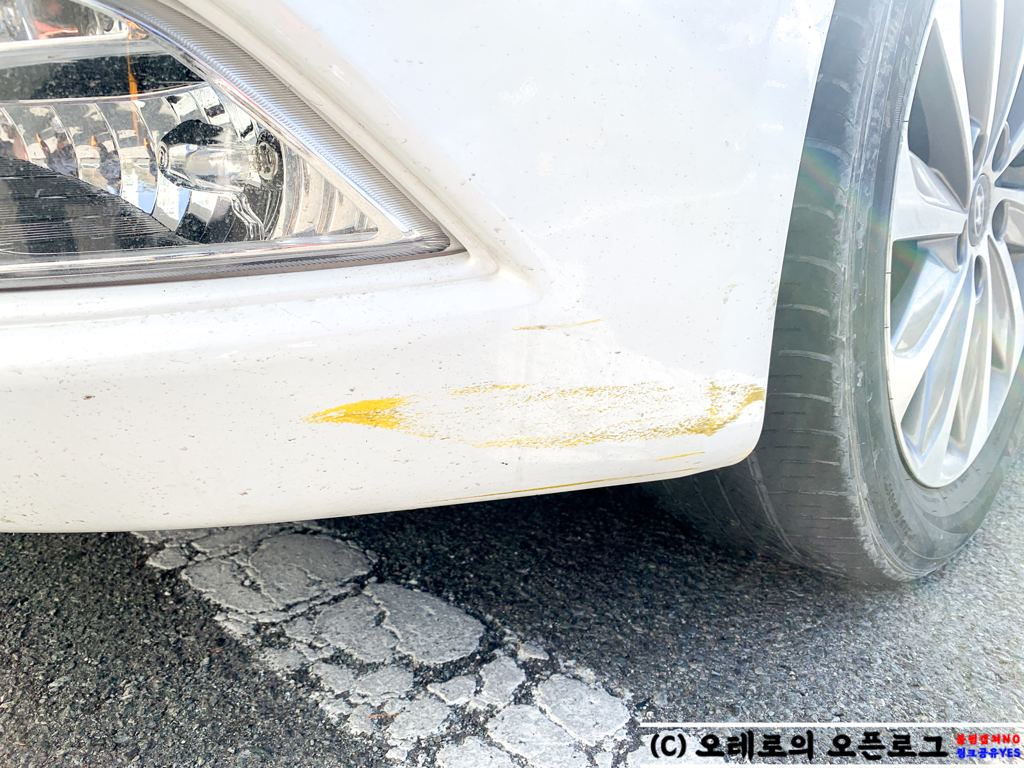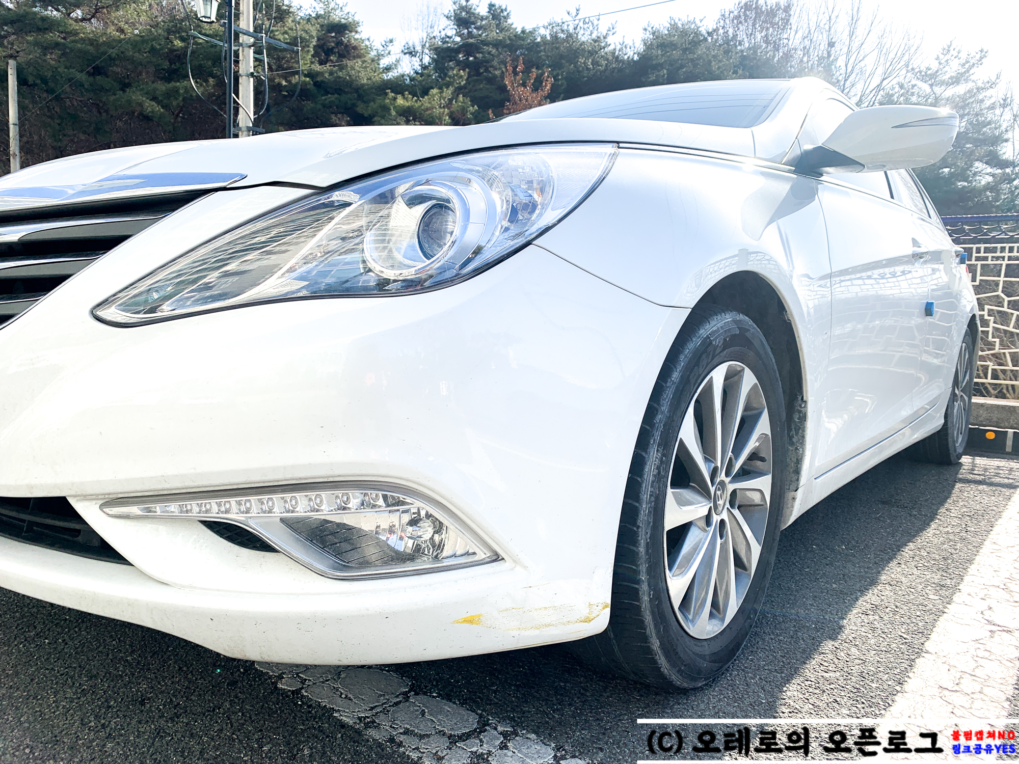어디선가 주차장이었던가 범퍼가 긁혀서 노란색 페인트가 묻어 흠집이 생긴 YF소나타 브릴리언트 차입니다. 차일피일 미루다미루다 이제는 각 잡고 깨끗하게 관리해보자 하고 마음 먹고 이번에 정보를 공유하는 겸 사진을 찍으며 방법을 적어보기로 하였습니다.