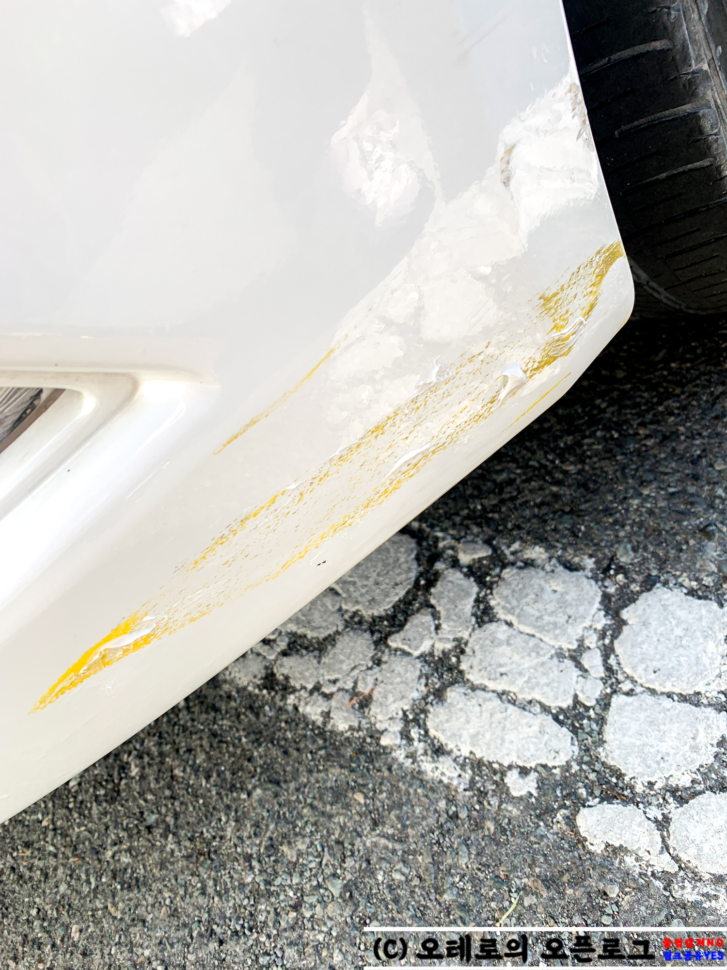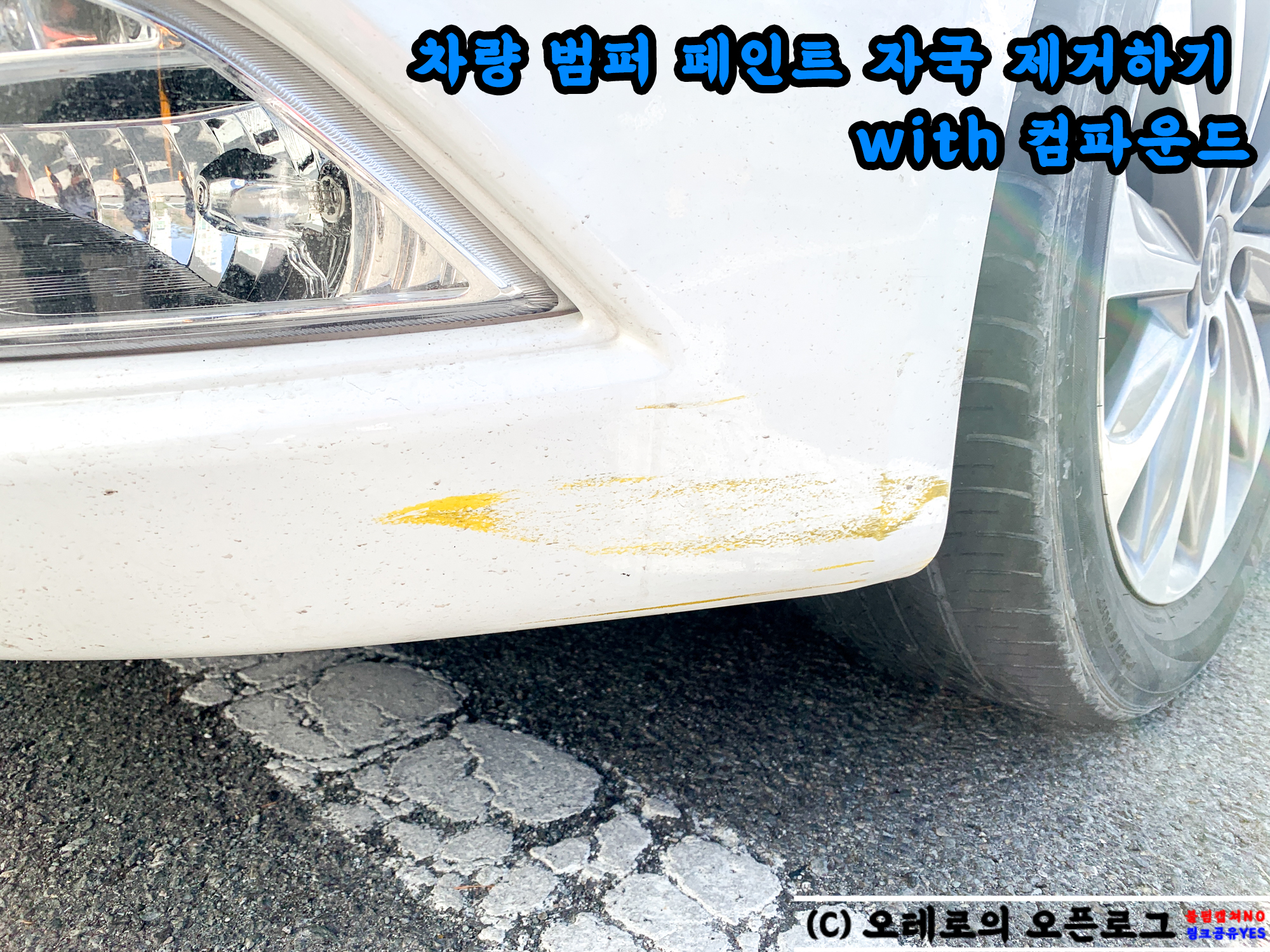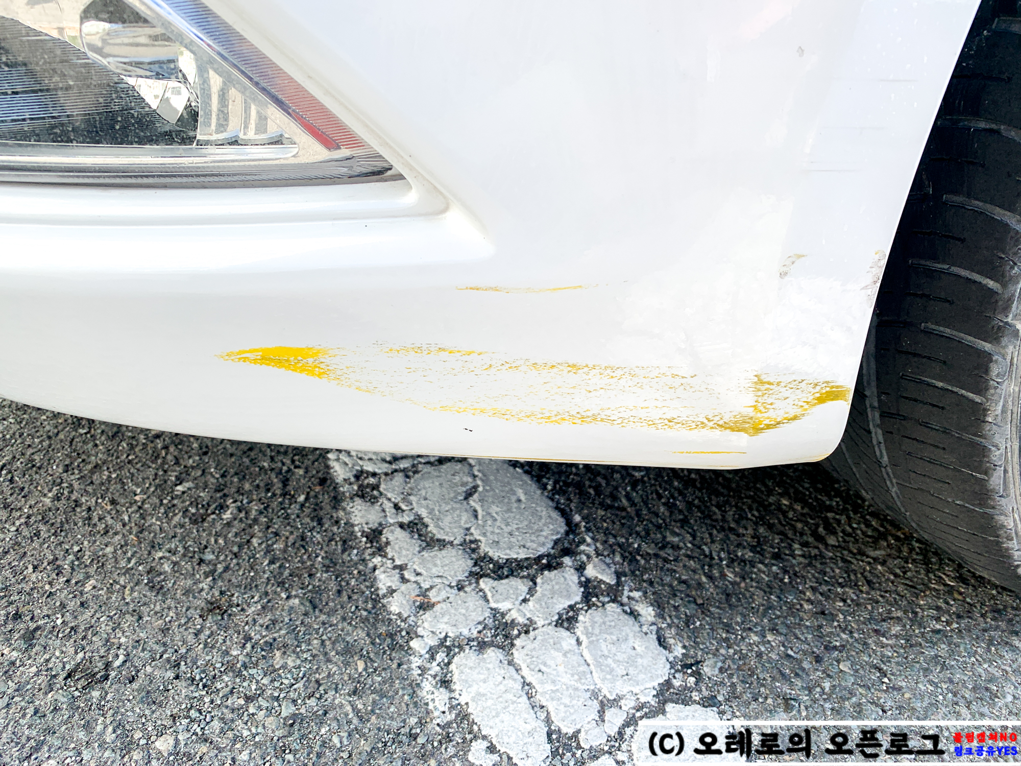 운전을 하다 보면 이런 기스가 있었나? 할 정도로 군데군데 내 차에 난 흠집과 기스가 보이기 시작합니다. 중고차라면 속쓰림이 좀 덜할지 모르지만 어떤 차종이든 내 차에 난 흠집과 기스를 보면 마음 아프기 마련입니다. 이걸로 도색하기는 돈이 많이 들어가니 하기 망설여지고.. 그렇기 마련입니다. 그런데 사실 차에 생긴 잔 기스와 흠집에 더해 위 사진처럼 노란색 페인트 자국까지 범퍼에 묻어있는 상태를 카센터에 가지 않고서도 복원할 수 있는 방법이 있습니다.