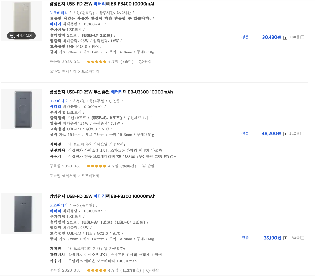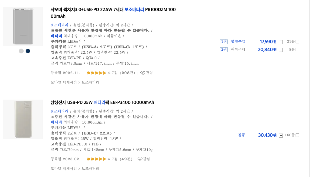 아마 주요 보조배터리 브랜드로 샤오미와 삼성전자 그리고 그외 기타 제조사로 크게 나누어 볼 수 있을 것 같습니다. 필자의 경우 샤오미 보조배터리를 10000mAh 용량부터 20000mAh 용량까지 도합 4개 이상 사용해 본 것으로 기억하며 삼성 보조배터리를 구매하여 사용해 본 적은 없었습니다. 모 가격비교 사이트에서 보조배터리를 조회해 본 결과가 위 스크린샷과 같습니다. 이제 비교해보겠습니다.
